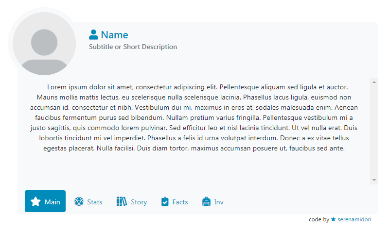 Basic card HTML made for Toyhou.se character profiles. Comes with a Main tab, a D&D stats and abilities tab, a backstory tab, facts and trivia tab, and an inventory tab.
